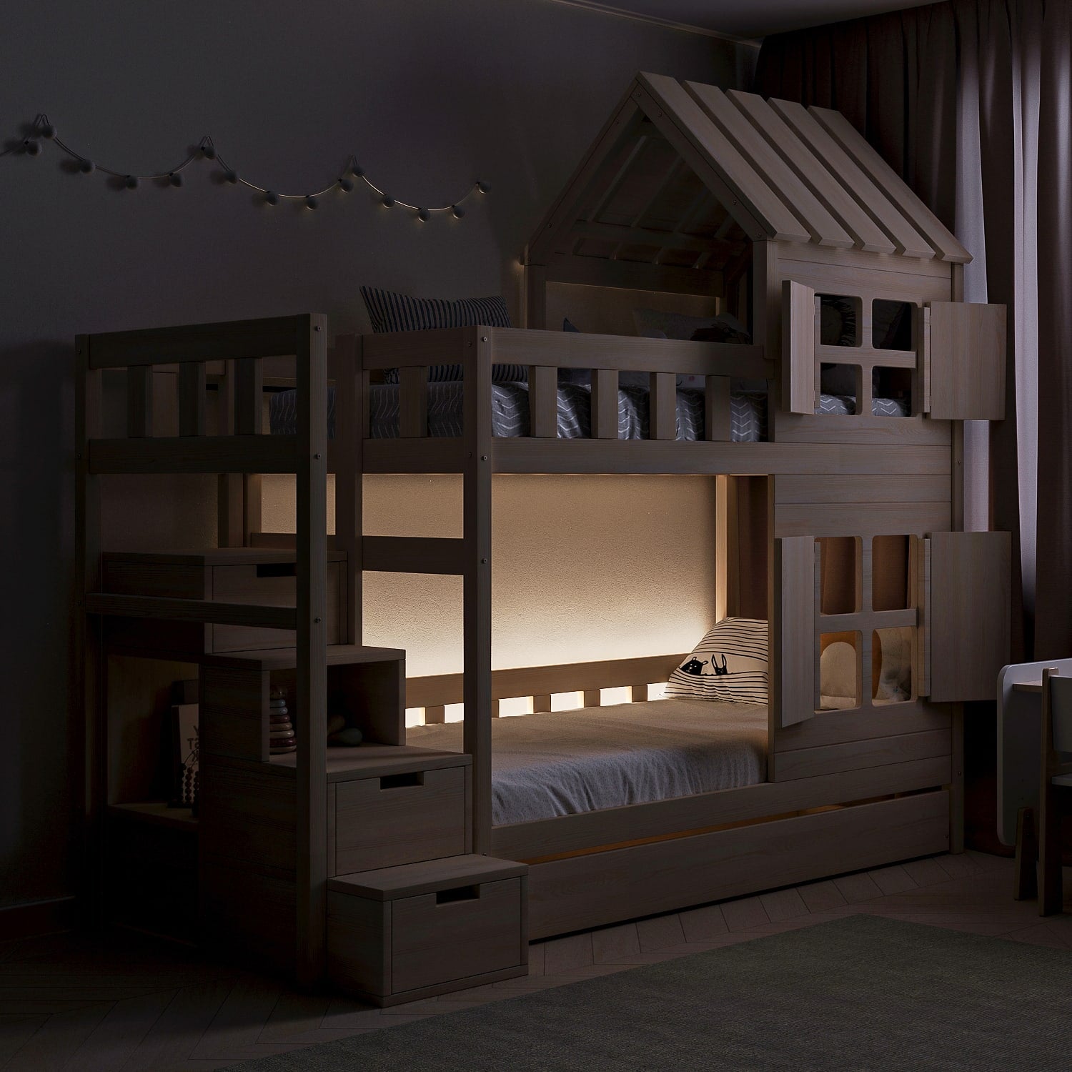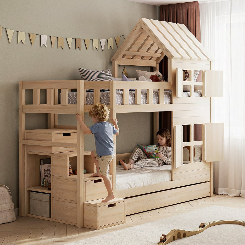 Créez une chambre magique pour deux enfants – le lit superposé BusyKids DREAM-HOUSE allie fonctionnalité, style et confort. Sa structure est fabriquée en bois massif de haute qualité, recouverte d’un vernis écologique et soigneusement traitée pour garantir une utilisation sûre par les enfants. Le lit supérieur est équipé d’une barrière de sécurité fiable, tandis que l’échelle latérale permet aux enfants de monter facilement et en toute sécurité. Sous le lit supérieur se trouvent des tiroirs spacieux qui aident à maintenir l’ordre et à optimiser l’espace.