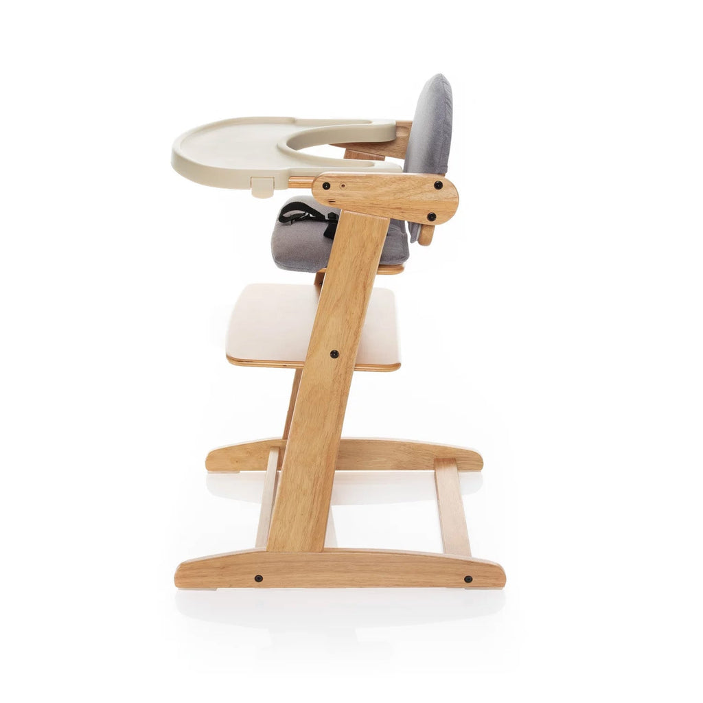 Avec siège réglable en hauteur et en profondeur, repose-pieds réglable, pratique plateau avec insert, ceintures de sécurité, rembourrage doux, capacité jusqu’à 60 kg et bois de haute qualité – voici la chaise haute Grow-up.