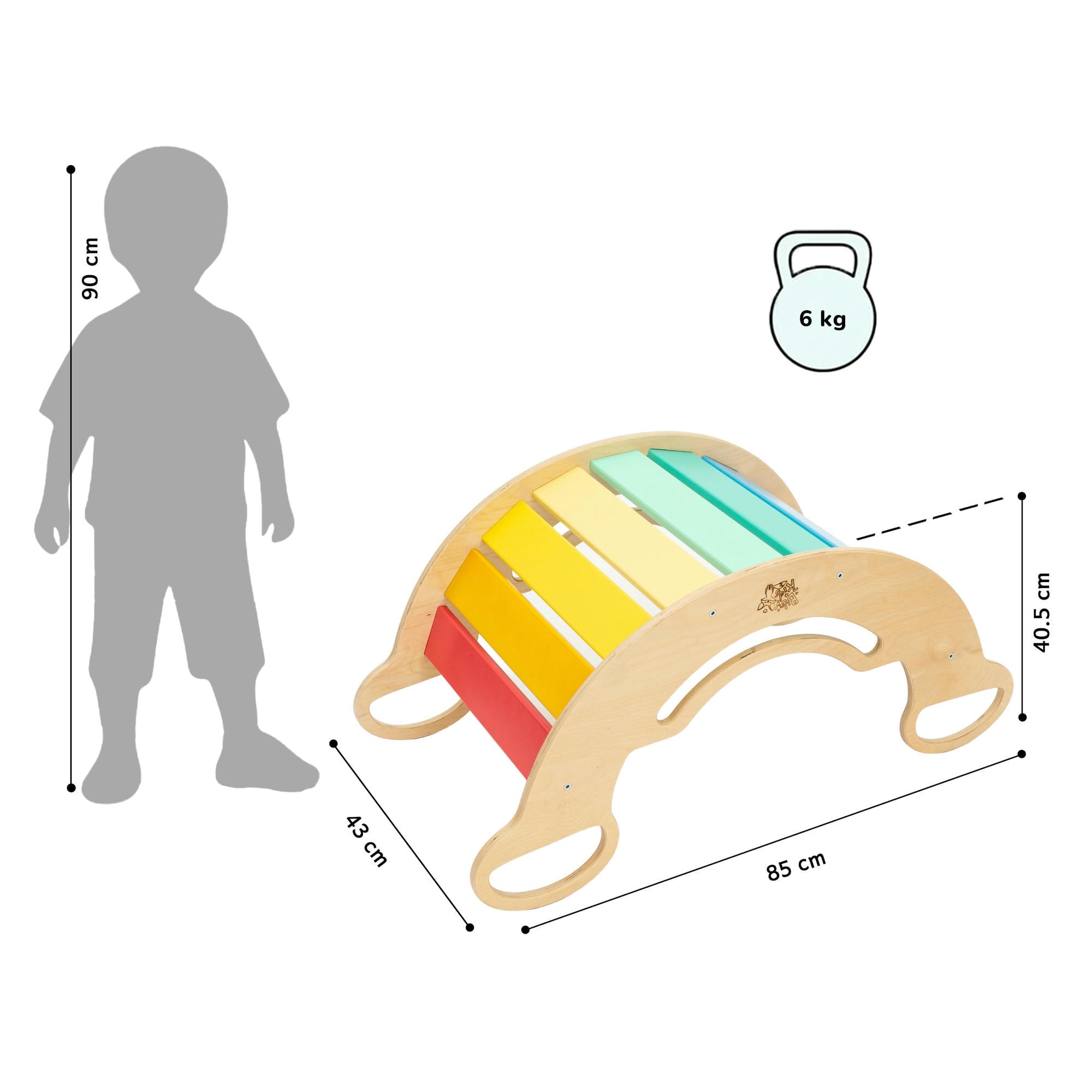 Comment laisser votre tout-petit bouger à sa guise, même si vous vivez dans un petit appartement et qu'il fait mauvais dehors ? Nous avons également résolu ce problème à de nombreuses reprises grâce à la balançoire d’équilibre en bois multifonctions. Les planches intérieures ont été peintes avec les belles couleurs de l'arc-en-ciel. Ainsi, même lors des tristes journées d'hiver, la chambre d'enfant ou le salon paraîtront lumineux.