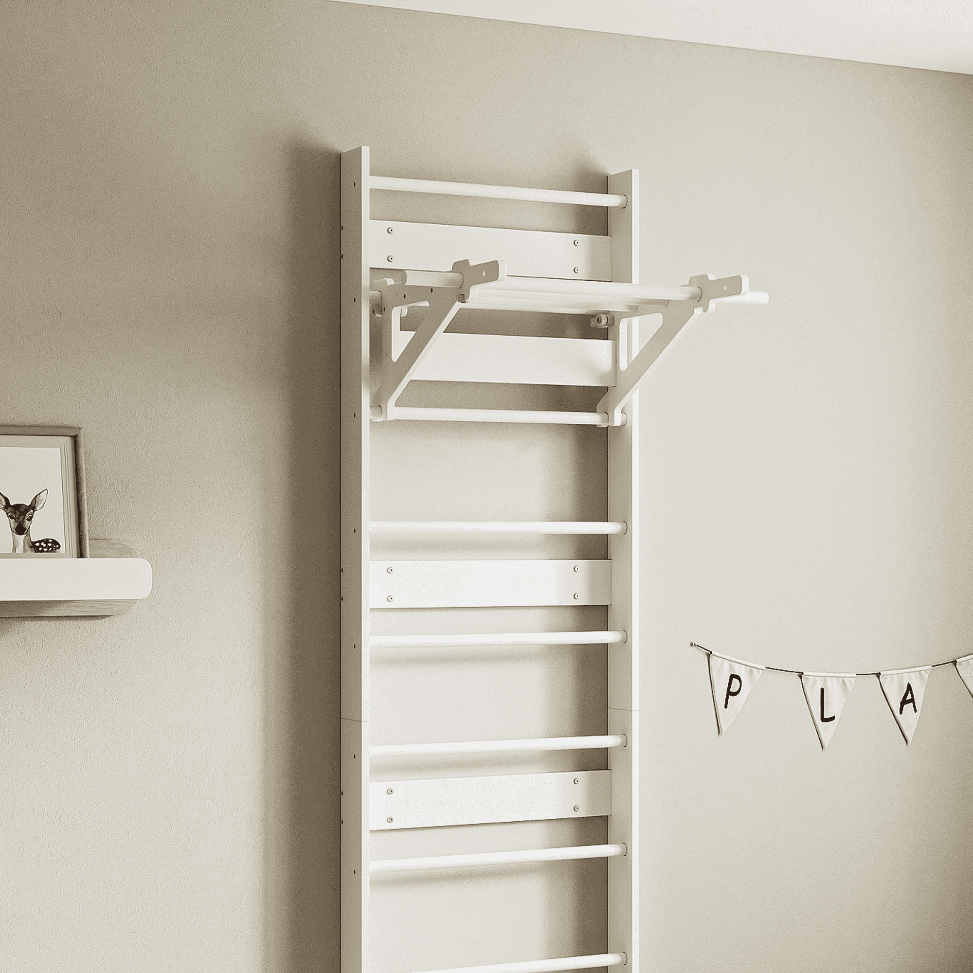 - Polyvalence 3-en-1 : Cette barre sert de support pour accrocher des accessoires (anneaux, balançoire) et sert de base pour le Plateau de bureau (vendu séparément).