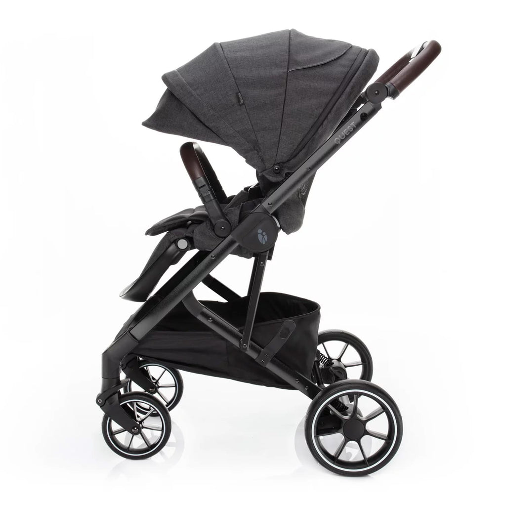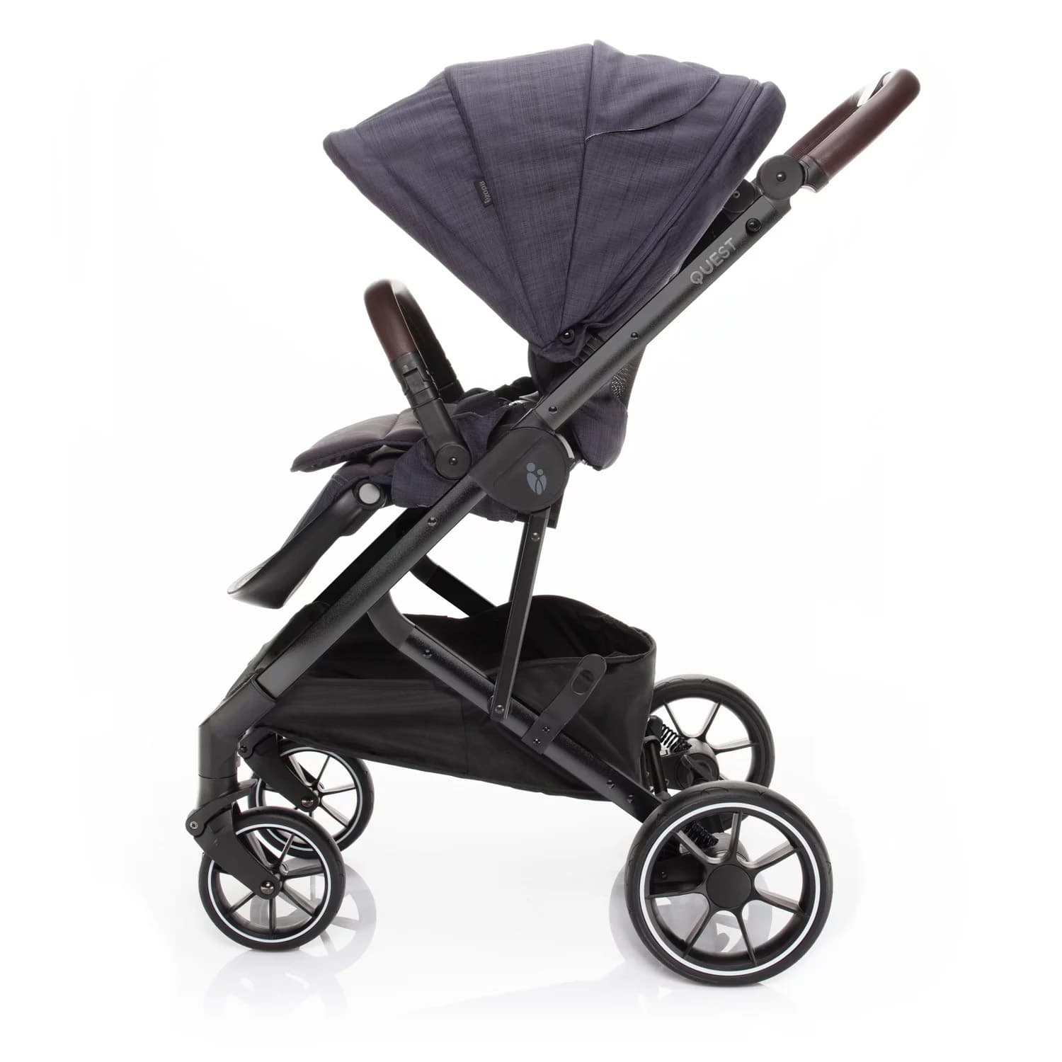 La poussette Quest se plie en quelques gestes, même avec l’assise sport installée – face route ou face parents. Plus besoin de chercher un appui : une fois pliée, la poussette tient debout toute seule. Un verrou de sécurité empêche tout dépliage accidentel. Avec son poids de 11 kg, elle se transporte facilement partout où vous en avez besoin.