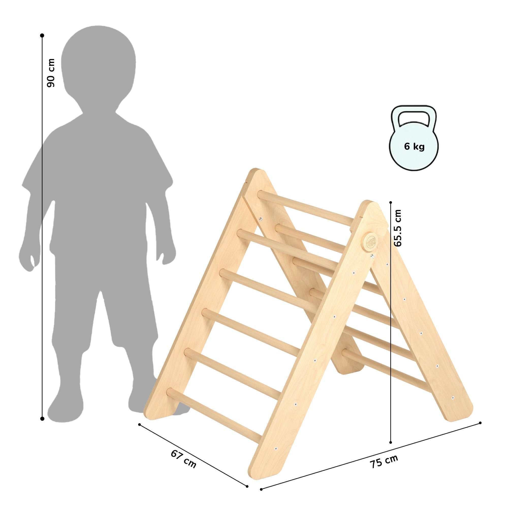 Le triangle de Pikler est fabriqué en contreplaqué de bouleau et composé de tiges en bois de 2,8 / 3,4 x 2,4 cm d'épaisseur. La surface est recouverte avec des vernis conformes à la norme EN71 Toy Safety Standard. Pour le nettoyer, il suffit d'essuyer la surface avec un chiffon humide.