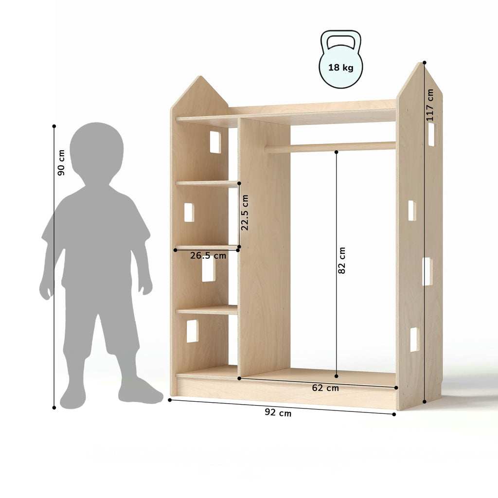 Nous vous présentons une solution fonctionnelle pour le stockage efficace et l'organisation des vêtements - une armoire enfant unique en forme de maisonnette qui viendra compléter nos best-sellers existants : les étagères de rangement pour jouets et livres de la même collection.