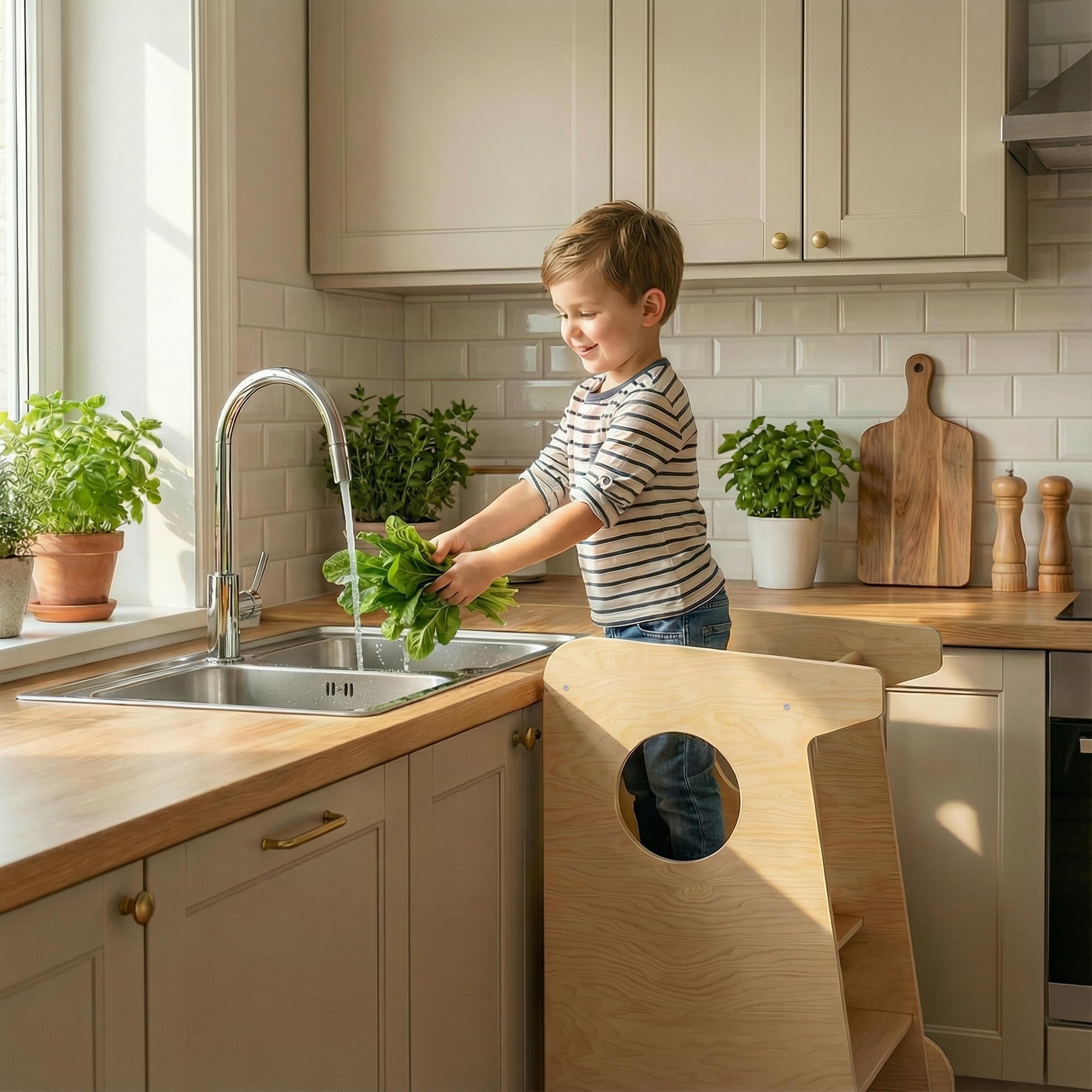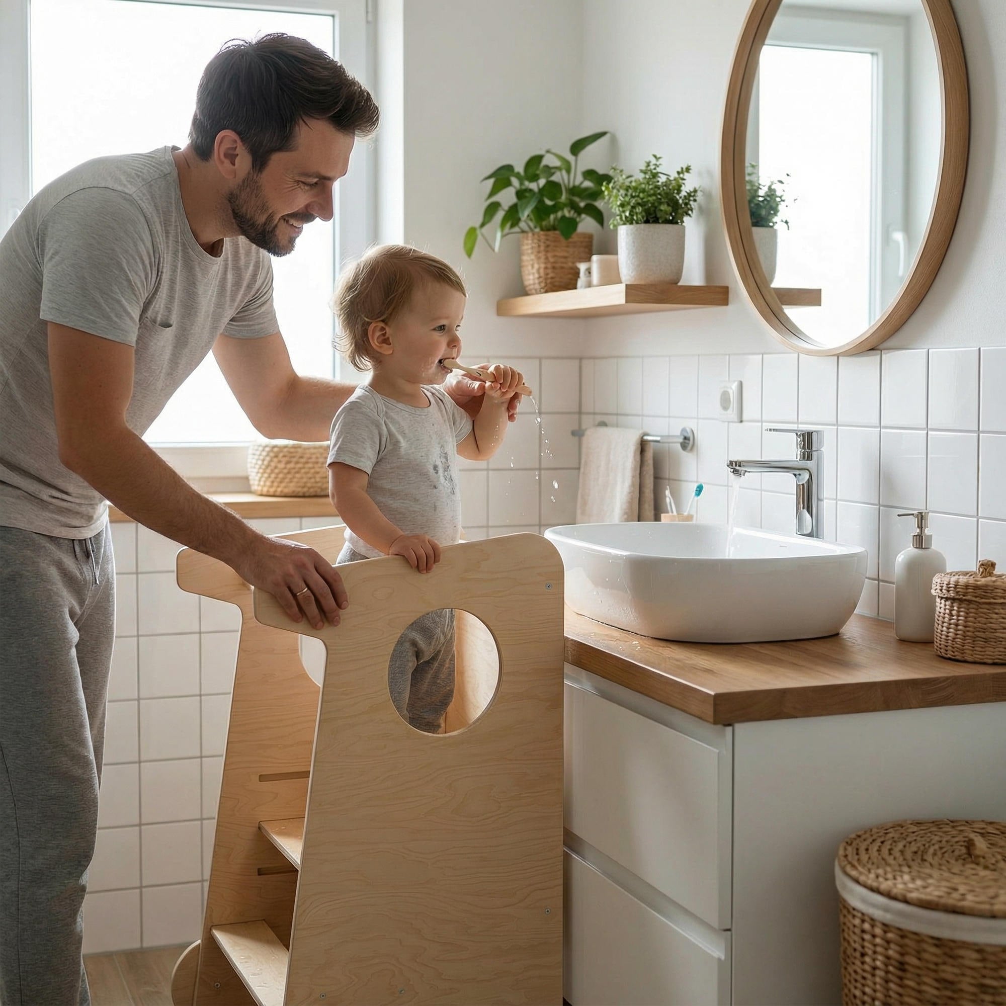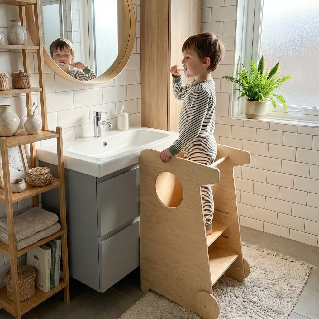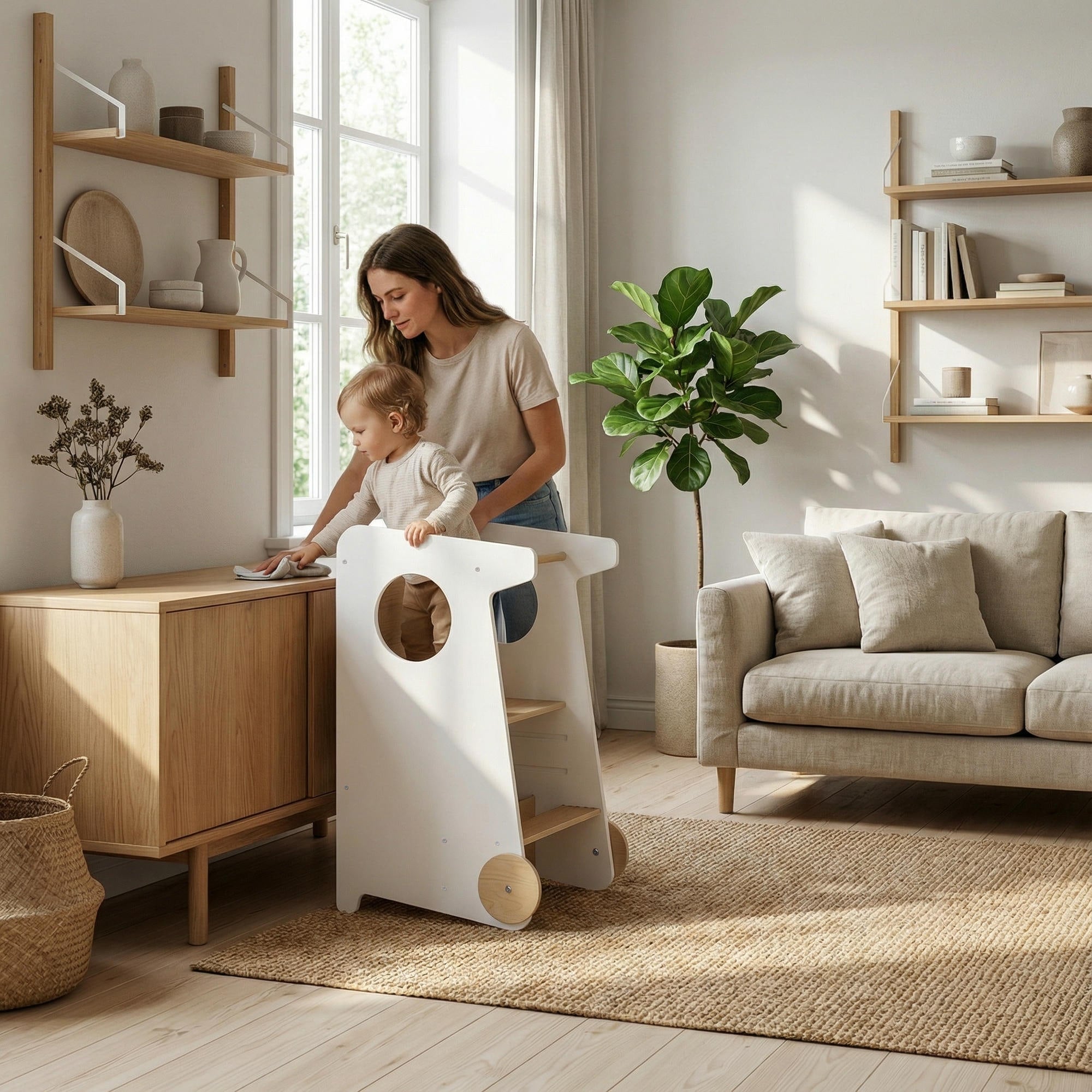Elle permet à votre petit de rejoindre en toute sécurité la hauteur des adultes et de participer aux activités quotidiennes — création, jeu ou soins personnels — tout en pouvant également aider les adultes dans la cuisine et les tâches domestiques.