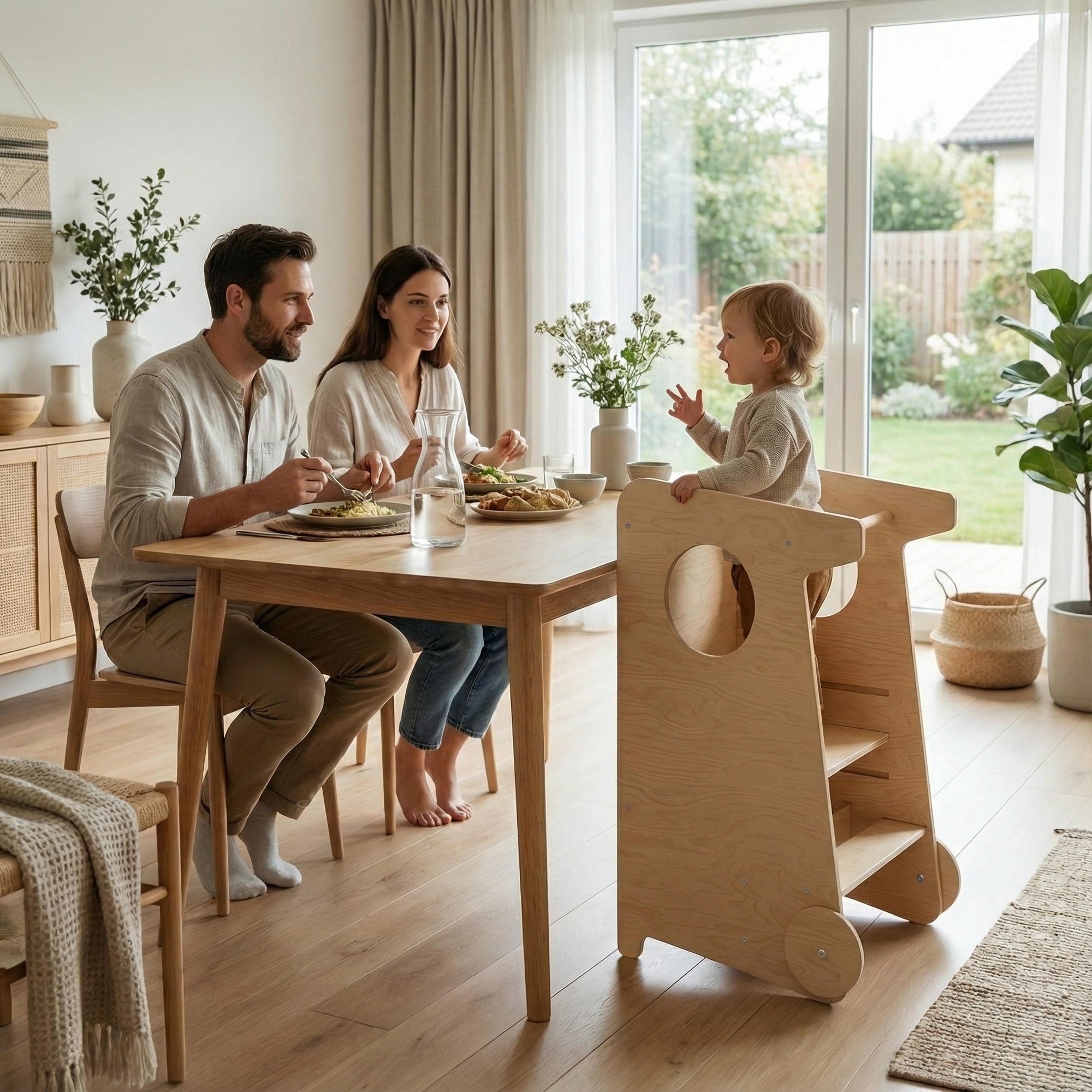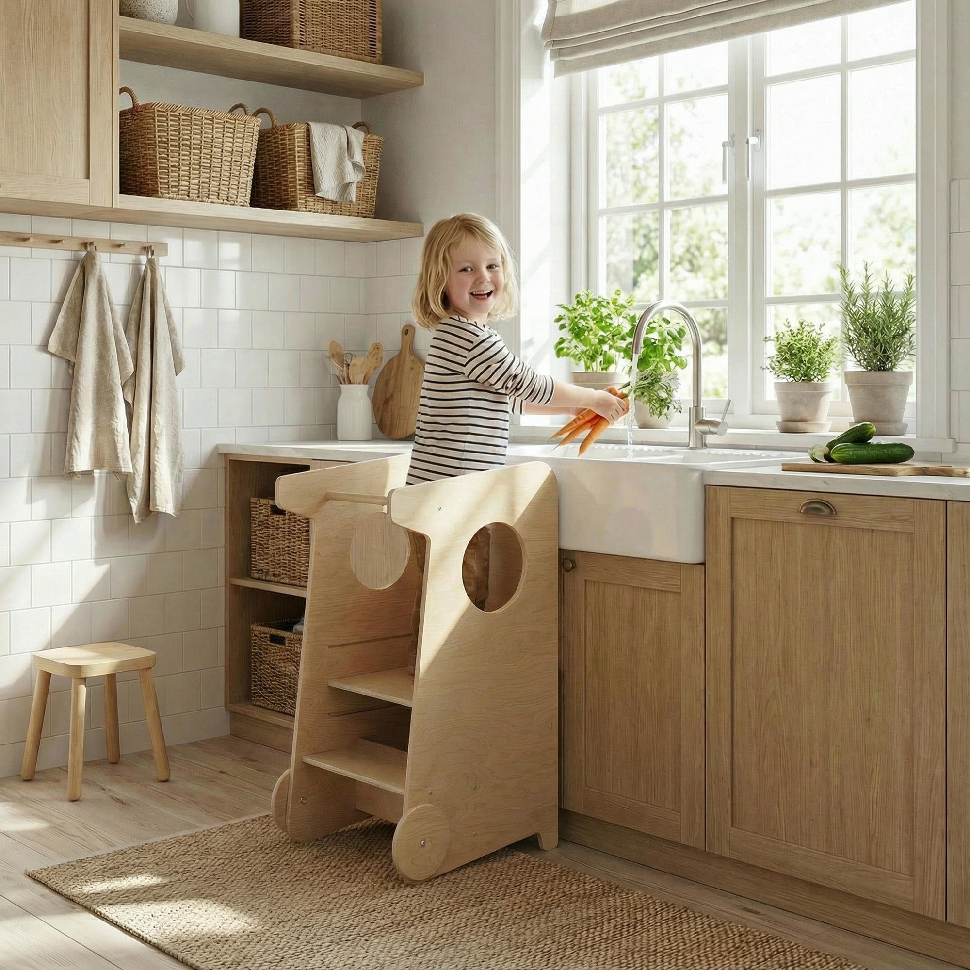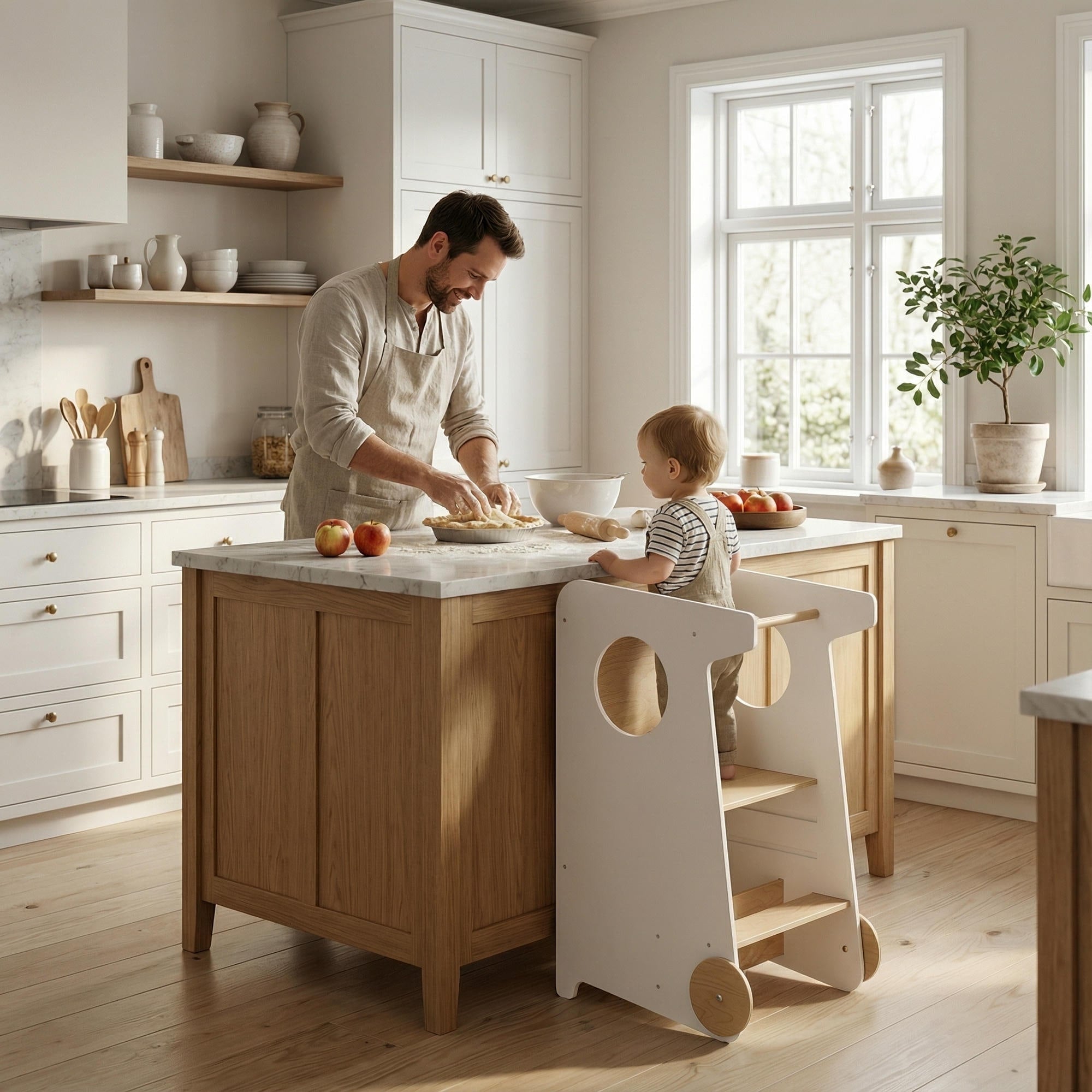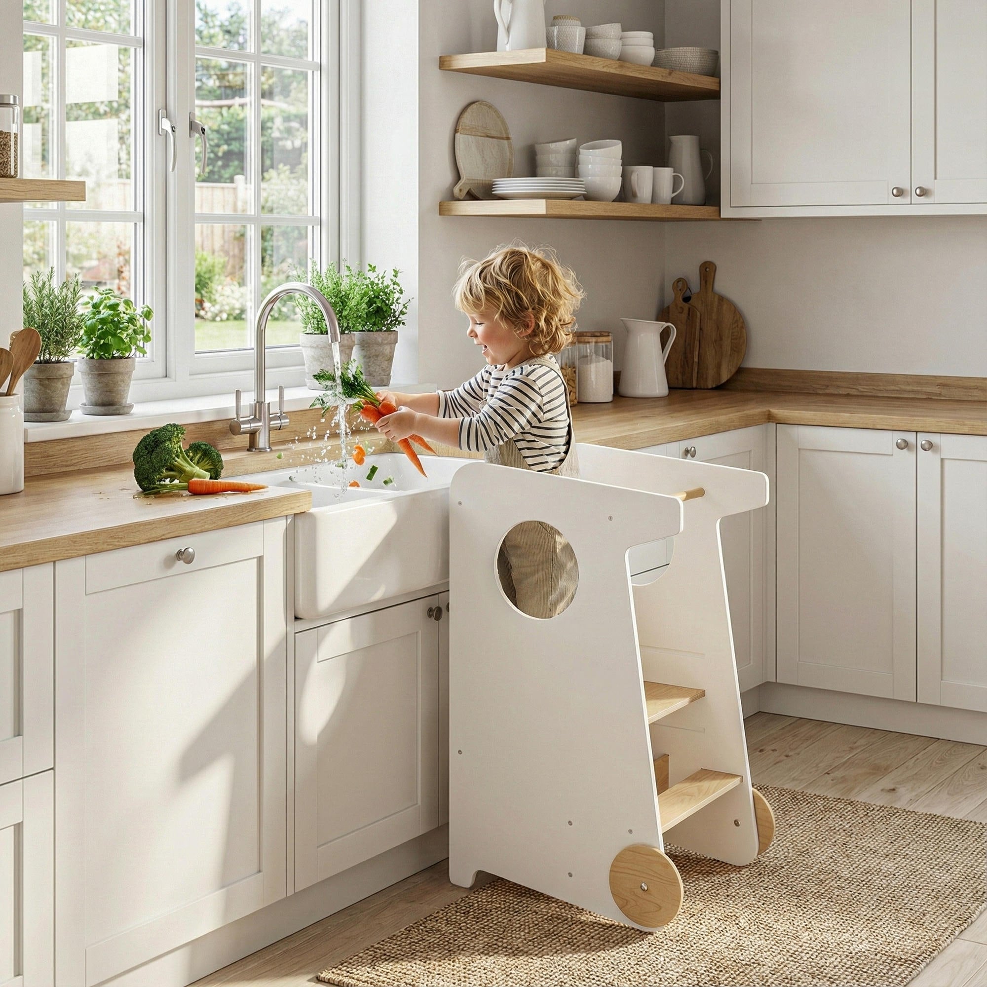 Elle permet à votre petit de rejoindre en toute sécurité la hauteur des adultes et de participer aux activités quotidiennes — création, jeu ou soins personnels — tout en pouvant également aider les adultes dans la cuisine et les tâches domestiques.
