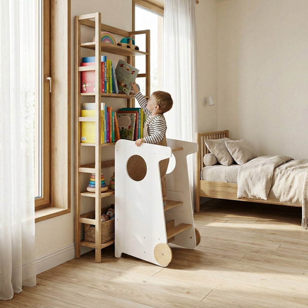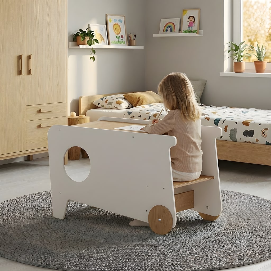 La conception réfléchie du BusyKids Tower LUMO assure un confort maximal et une utilisation très simple. La tour se transforme instantanément en table, en chaise ou en support fonctionnel. Grâce aux roulettes intégrées, l’enfant peut la déplacer seul dans la pièce, rendant l’apprentissage et le jeu encore plus captivants.