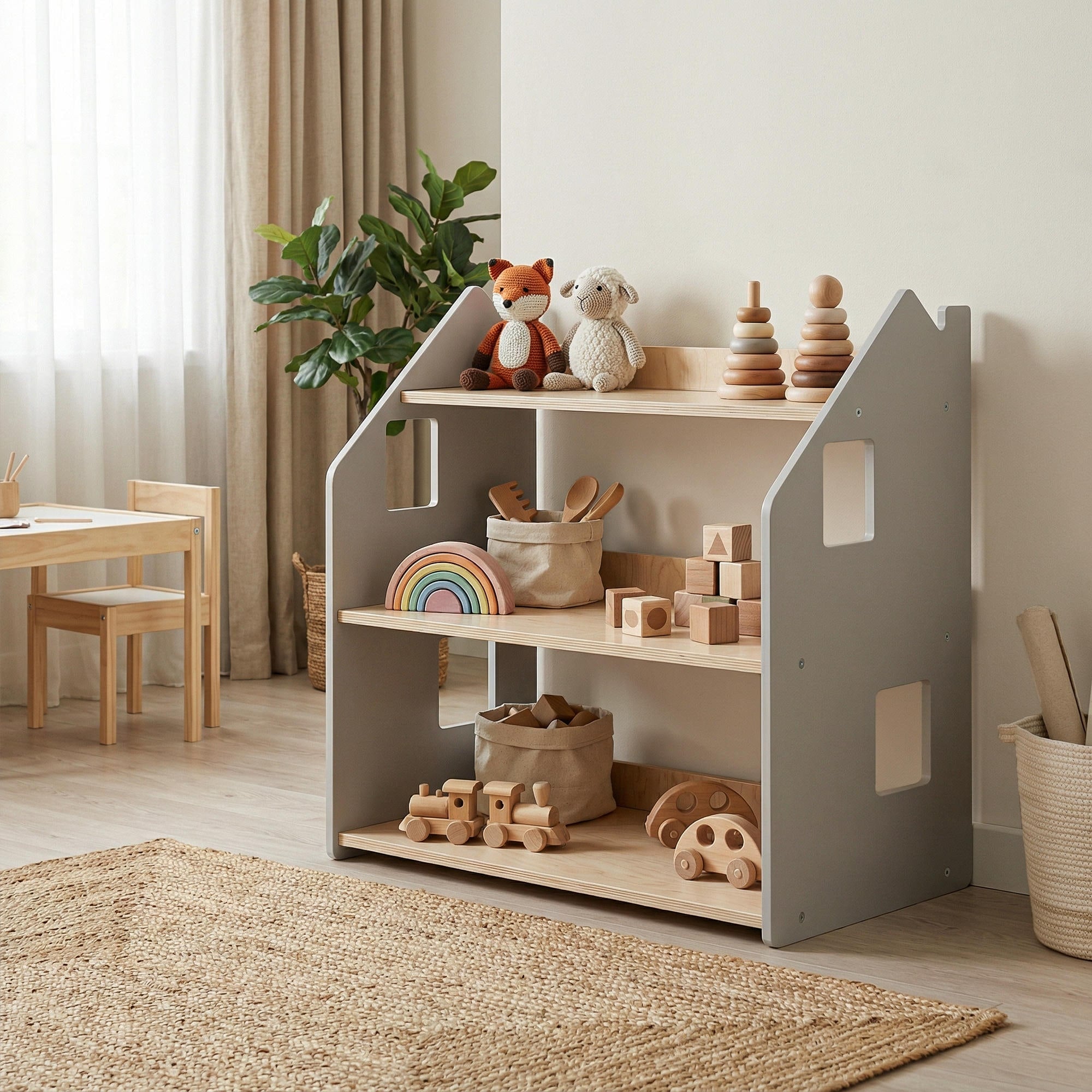 Une étagère à jouets inspirée de la méthode Montessori et de l'un de ses grands principes : aide-moi à faire tout seul.