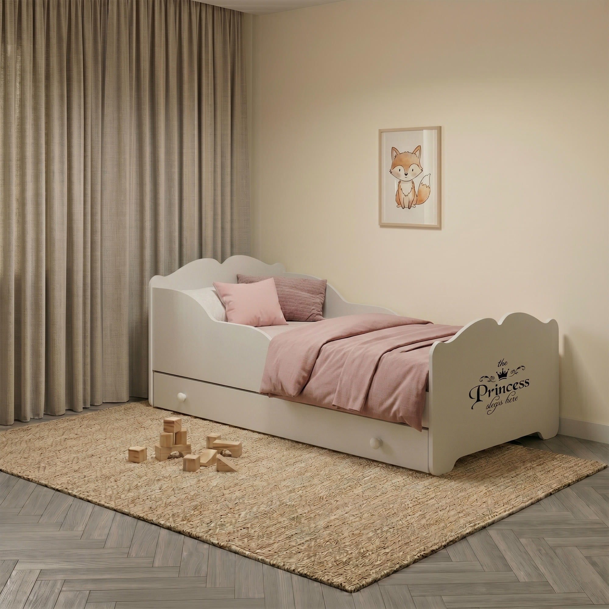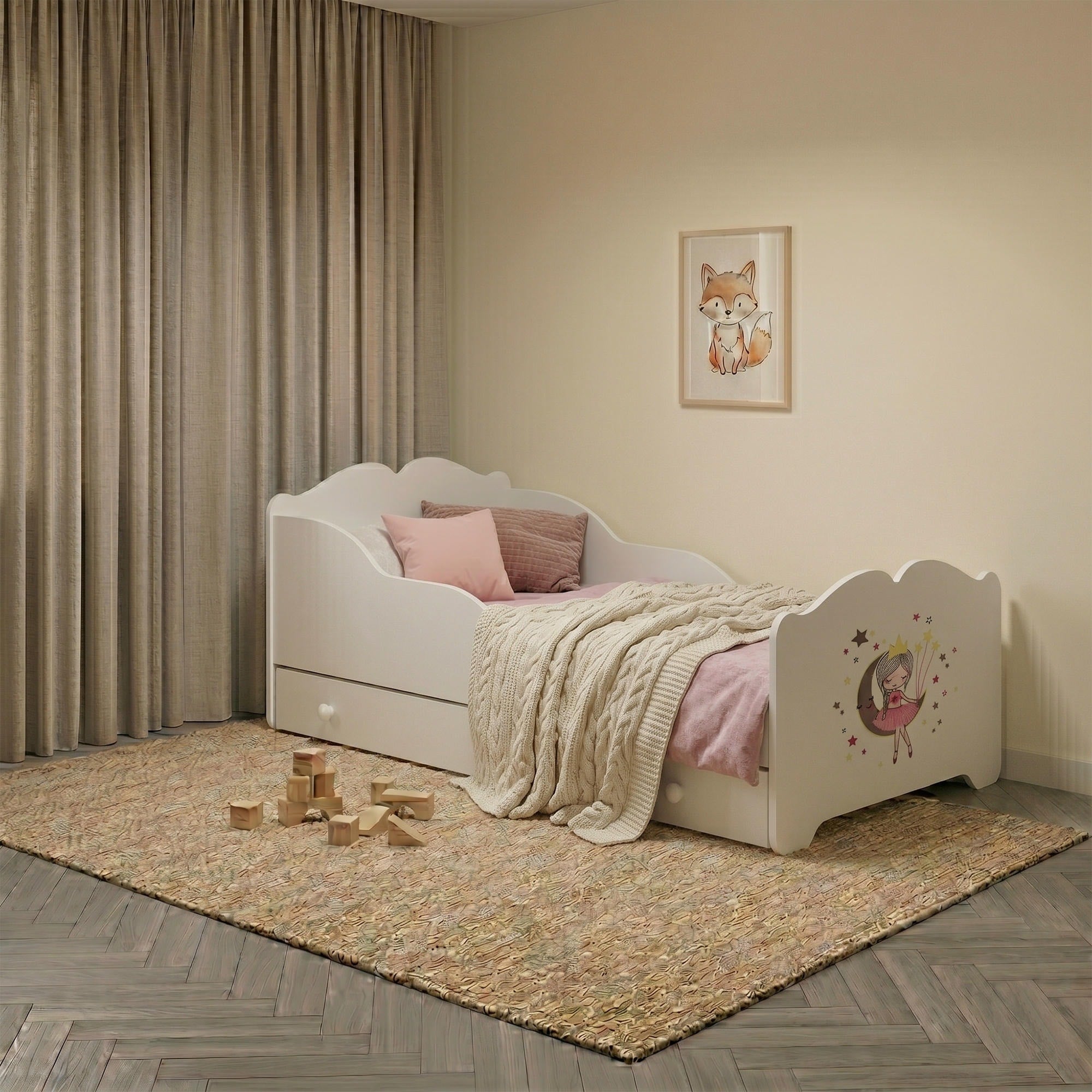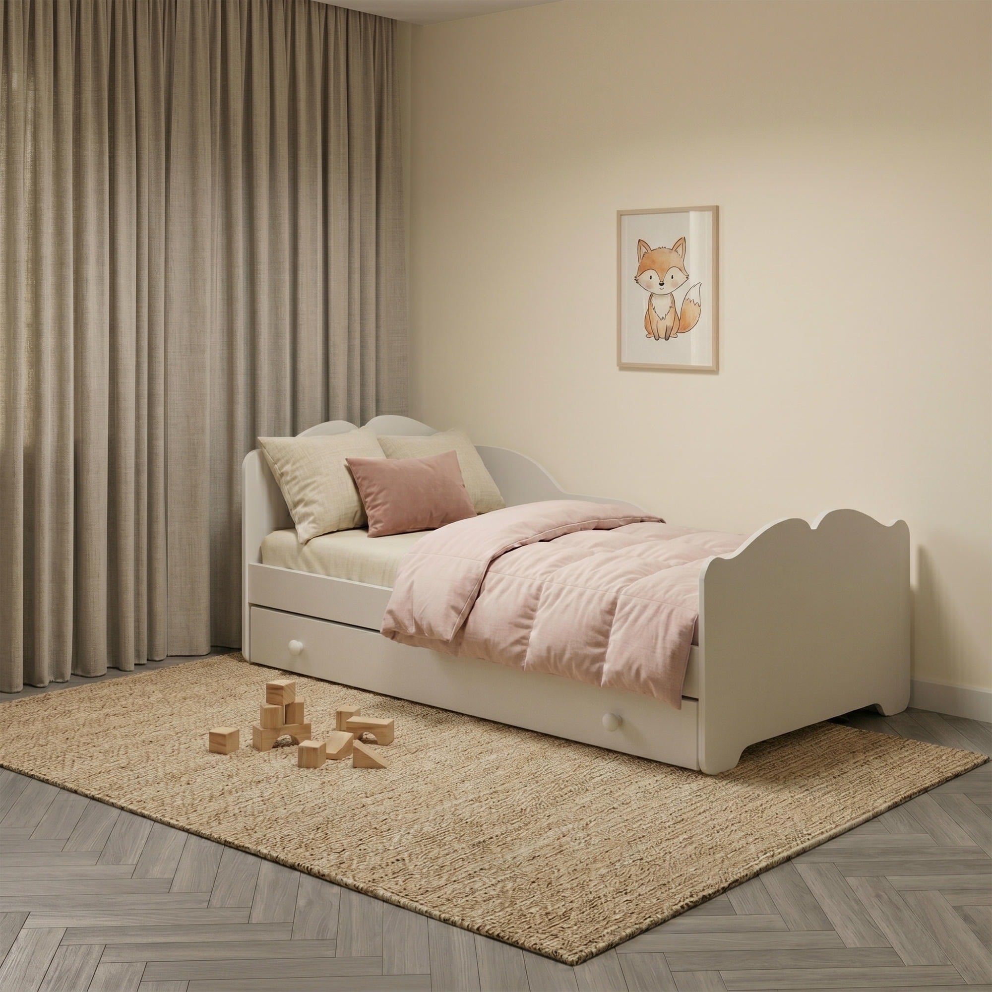 Le grand tiroir de rangement peut être installé à droite ou à gauche, ce qui permet d’optimiser l’aménagement de la chambre. Il est idéal pour ranger le linge de lit, les jouets ou d’autres accessoires pour enfant. Les poignées en bois complètent l’aspect soigné du modèle.