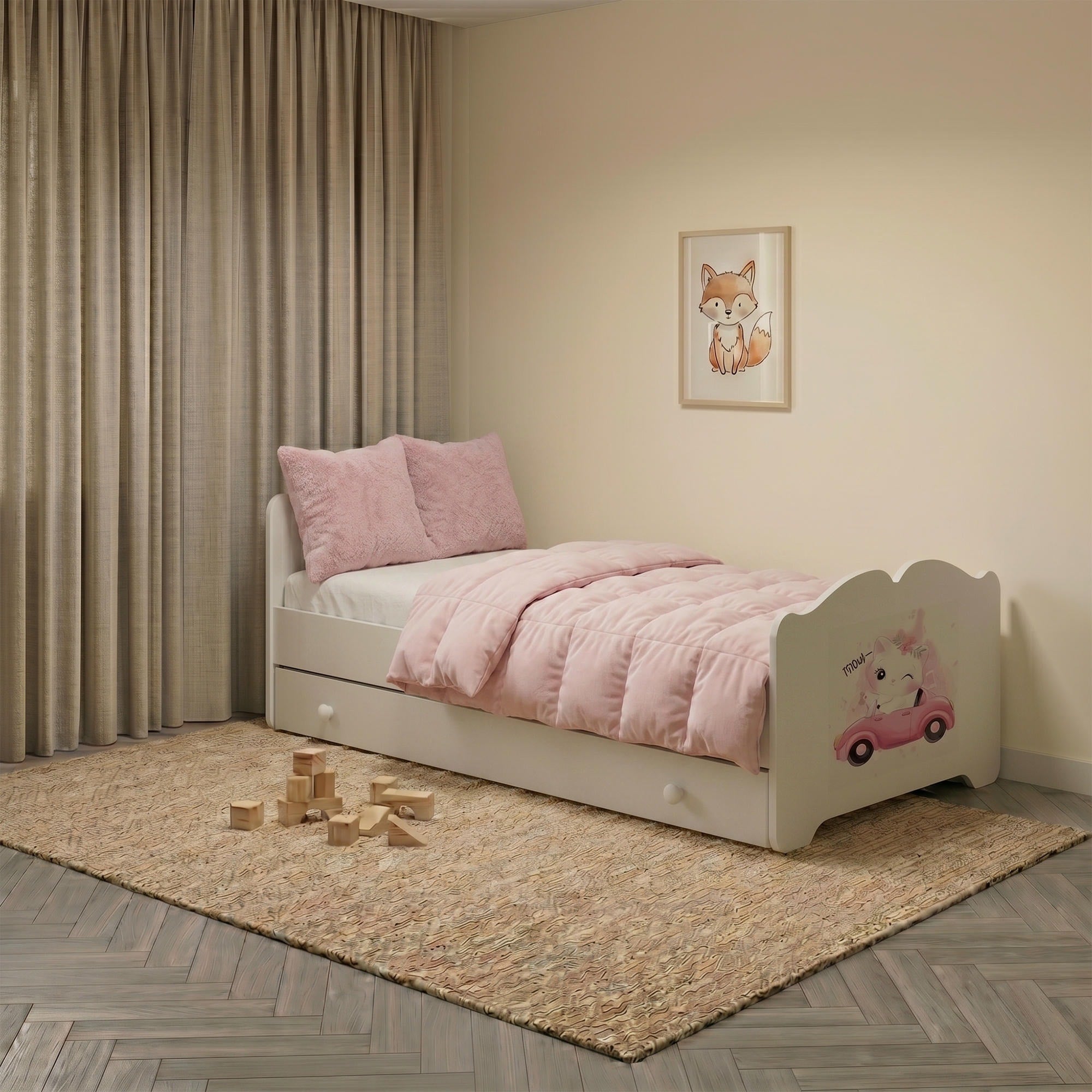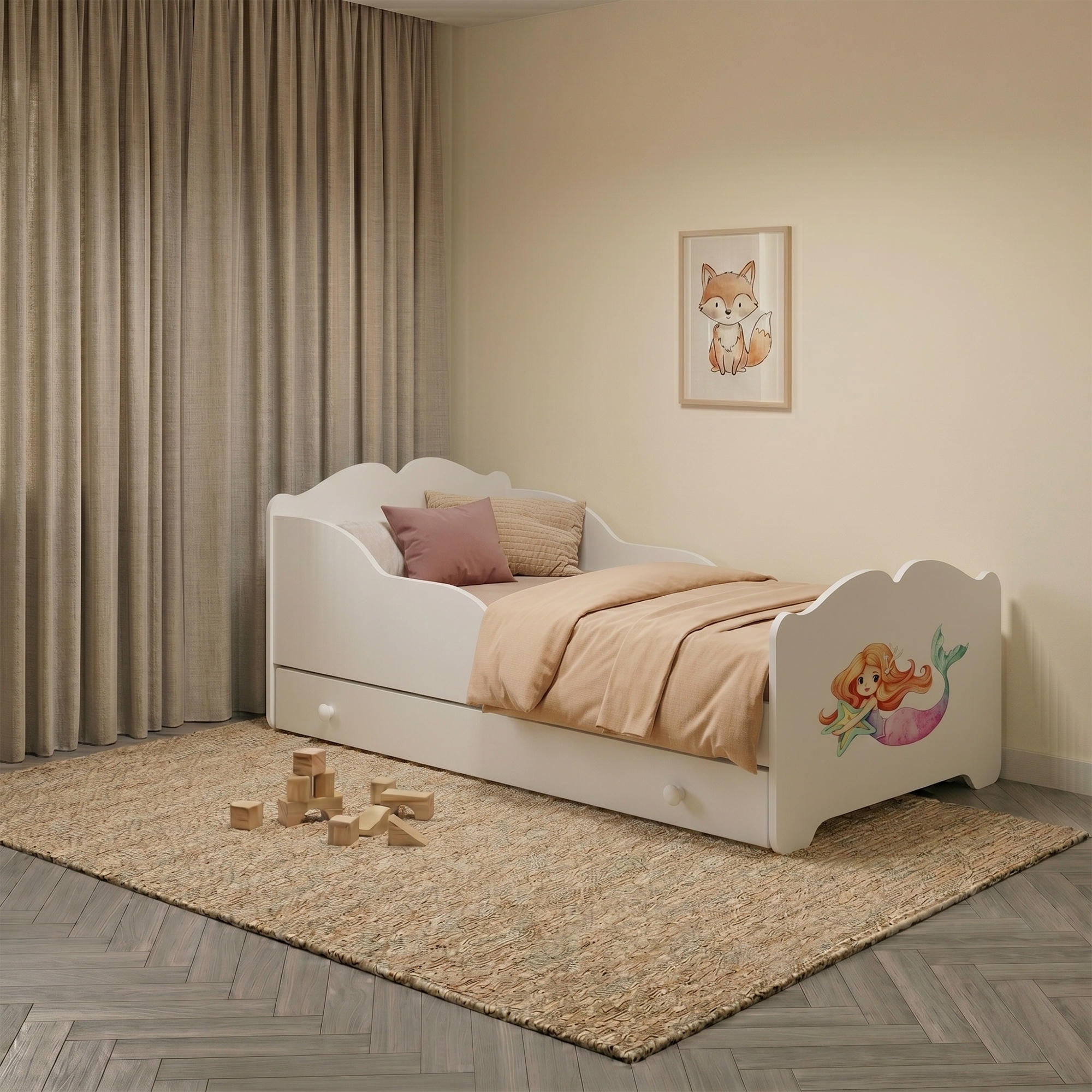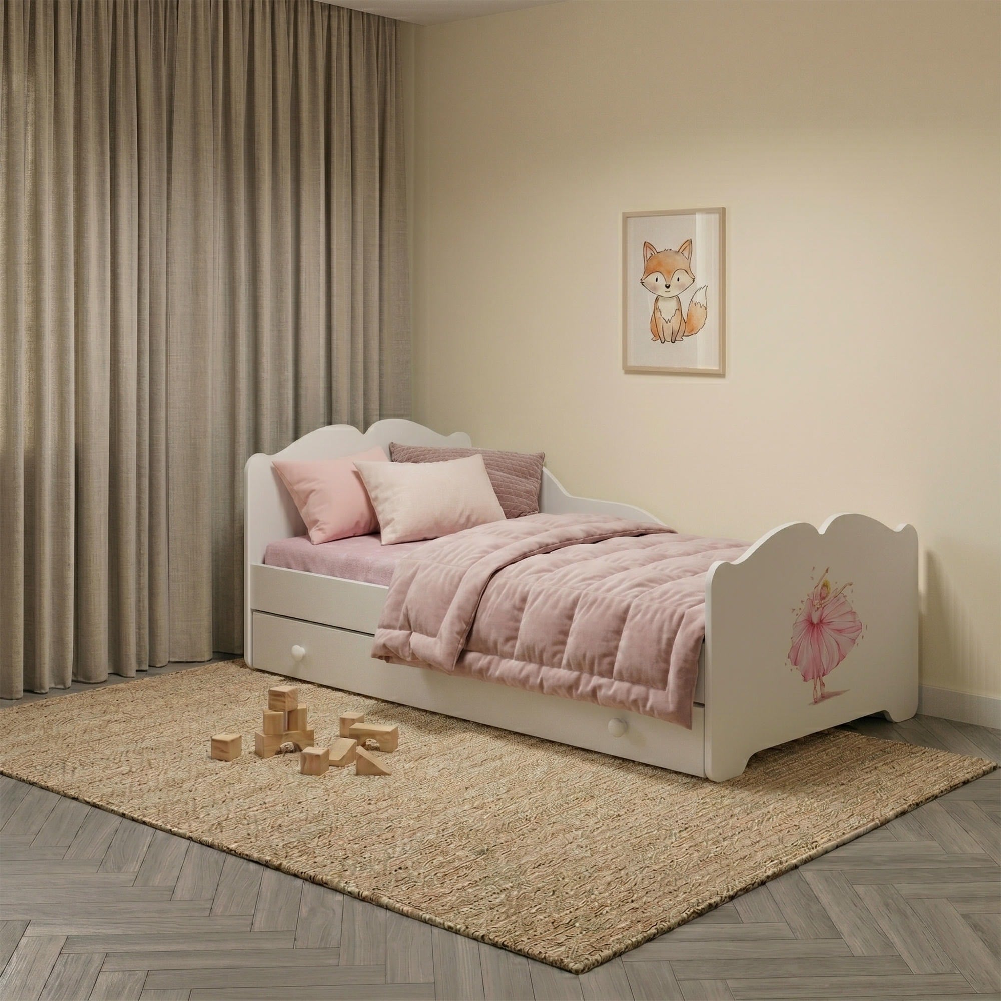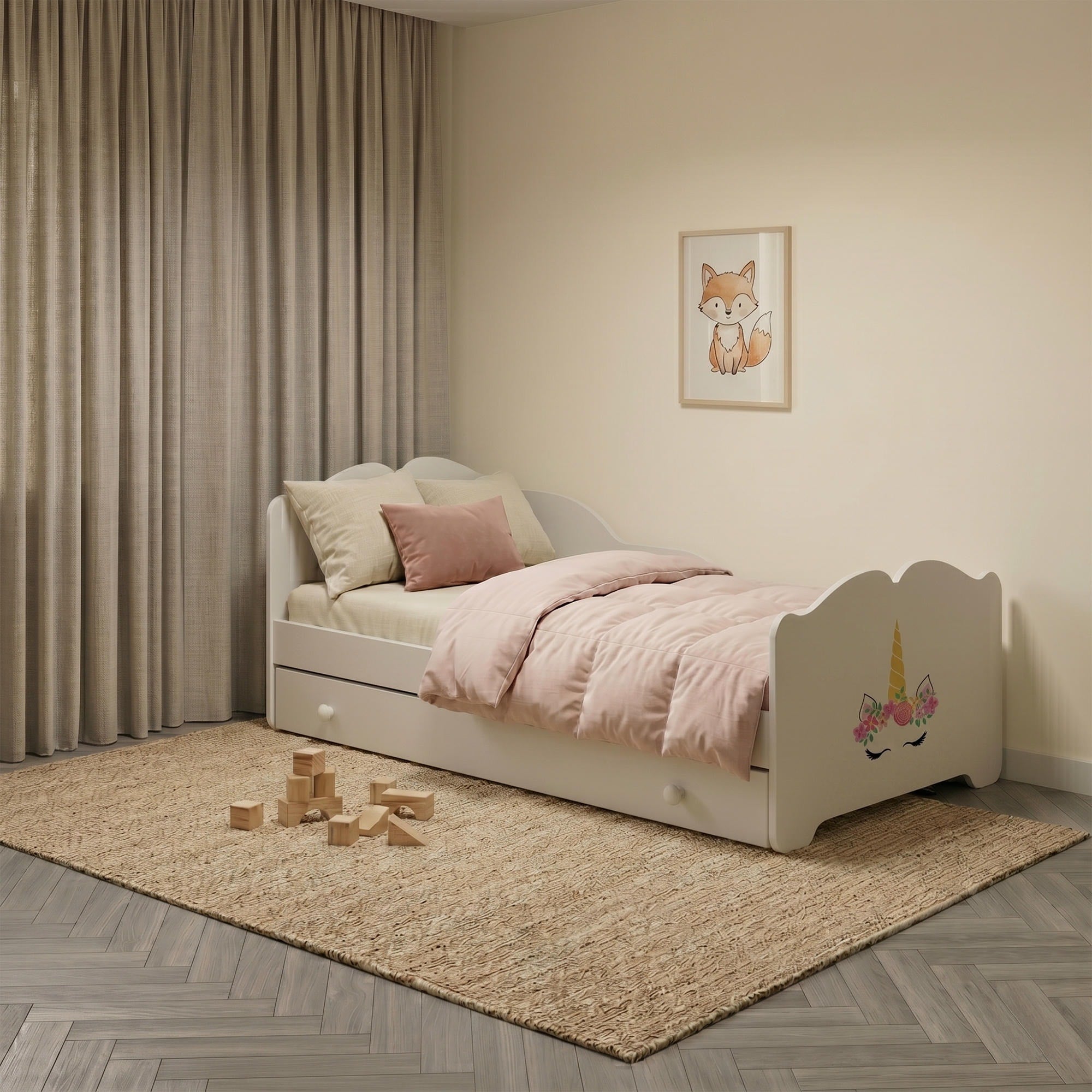 Le grand tiroir de rangement peut être installé à droite ou à gauche, ce qui permet d’optimiser l’aménagement de la chambre. Il est idéal pour ranger le linge de lit, les jouets ou d’autres accessoires pour enfant. Les poignées en bois complètent l’aspect soigné du modèle.