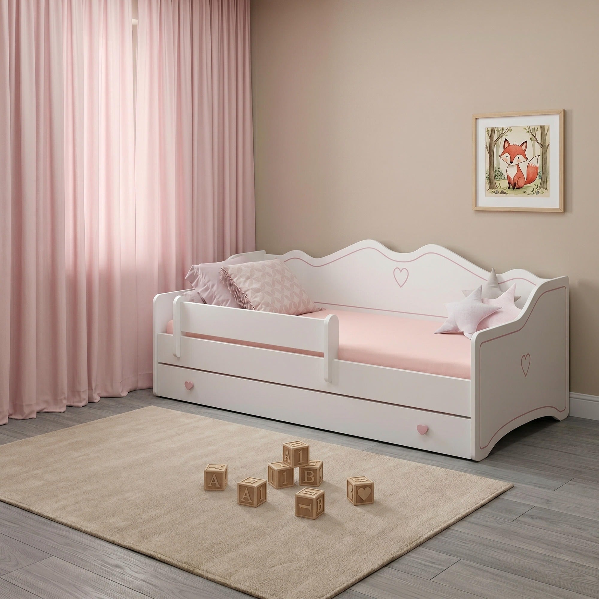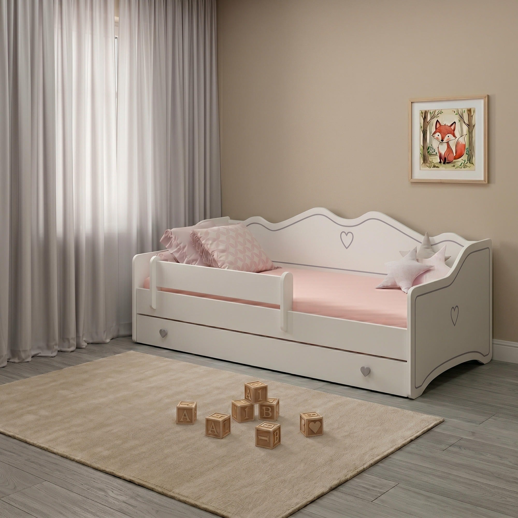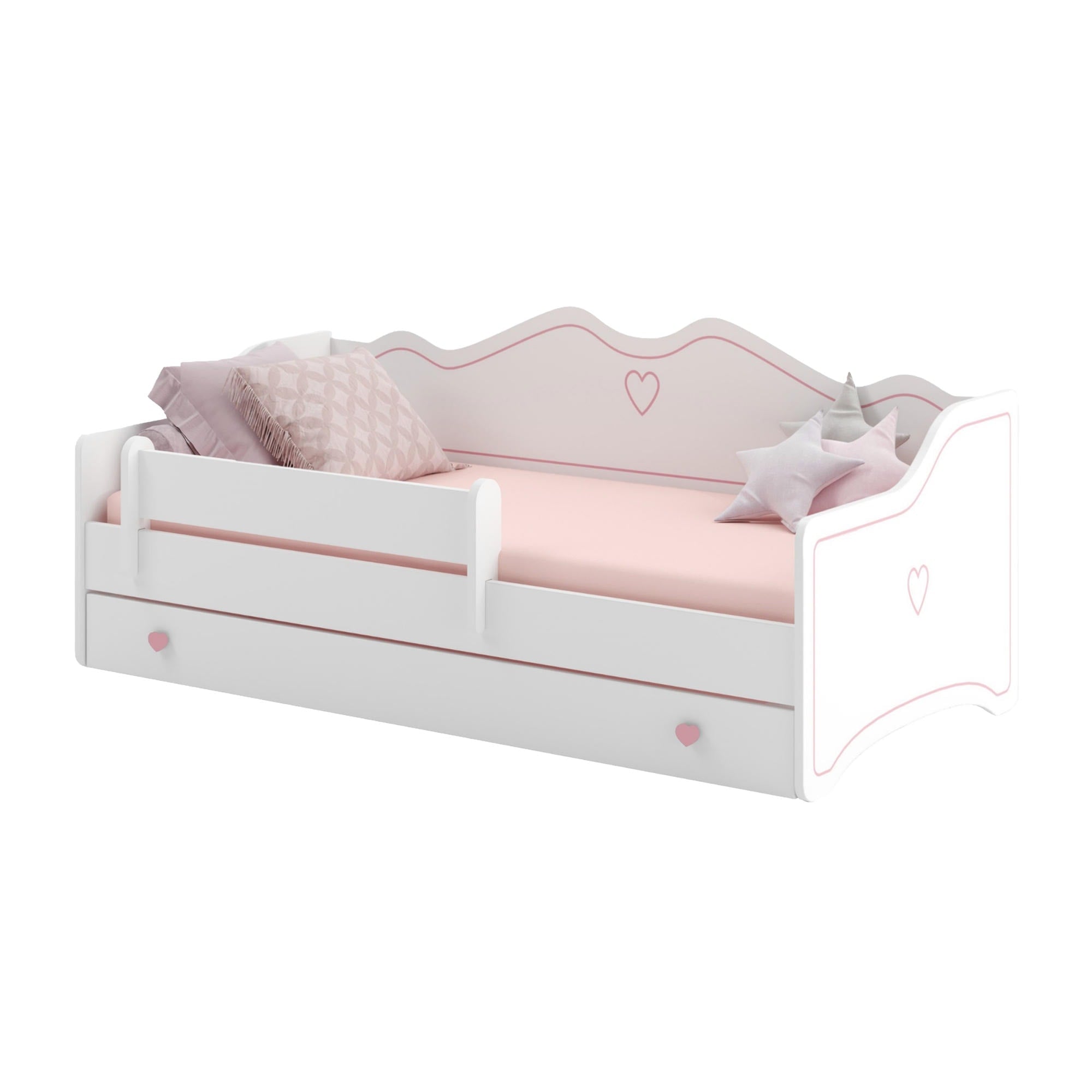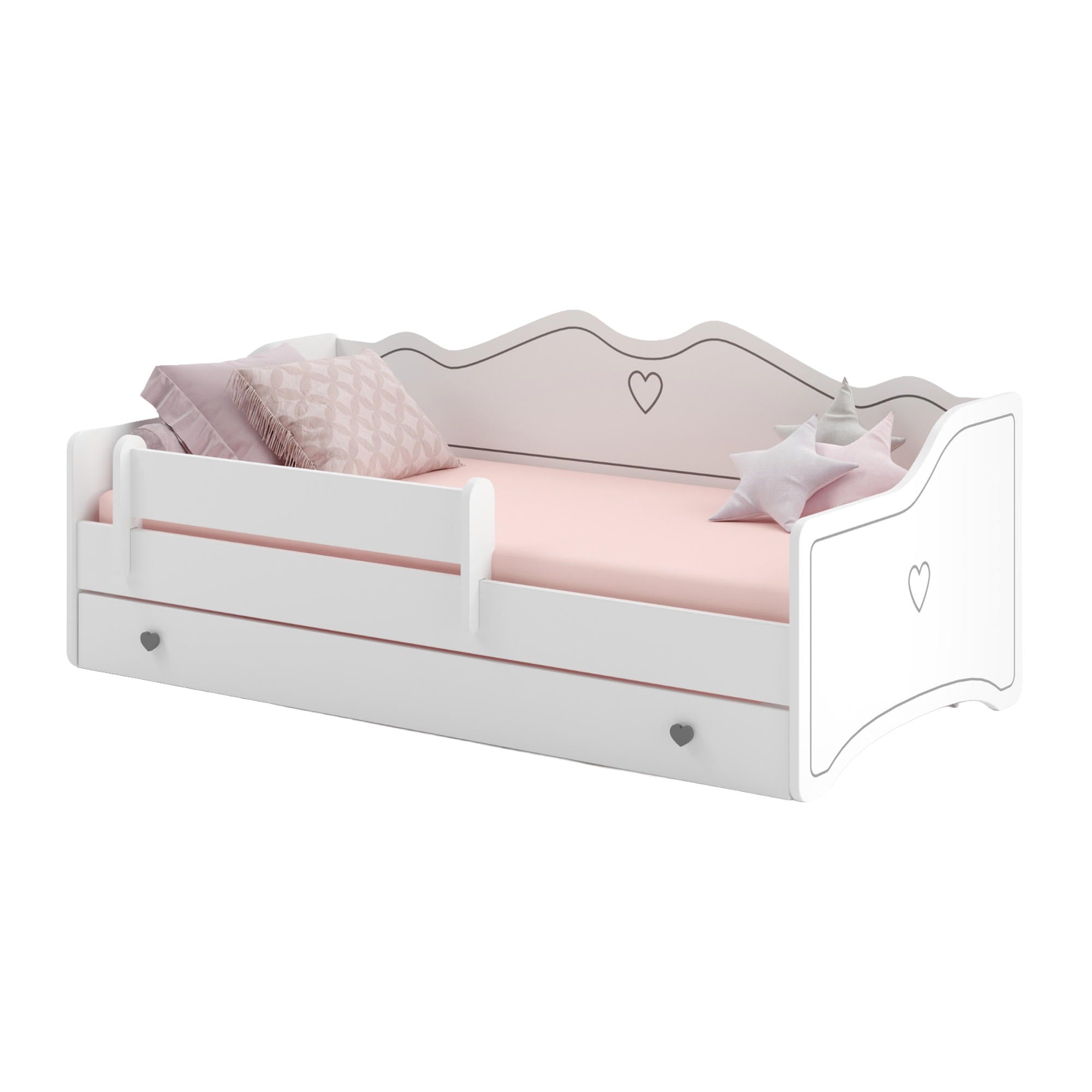 Le lit enfant EMMA associe confort, sécurité et design soigné. Sa finition blanche, ses détails décoratifs et ses poignées en forme de cœur en font un choix idéal pour une chambre de fille. Il s’intègre facilement à différents styles d’intérieur.
