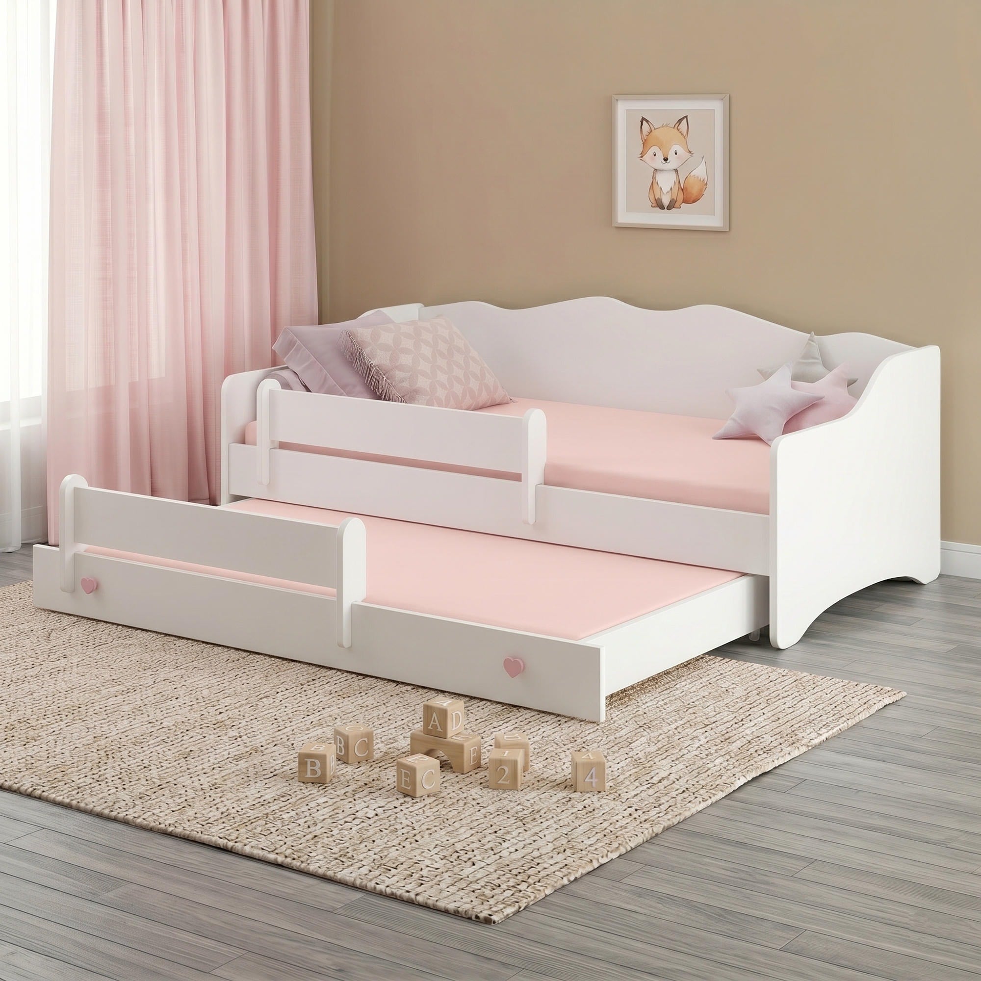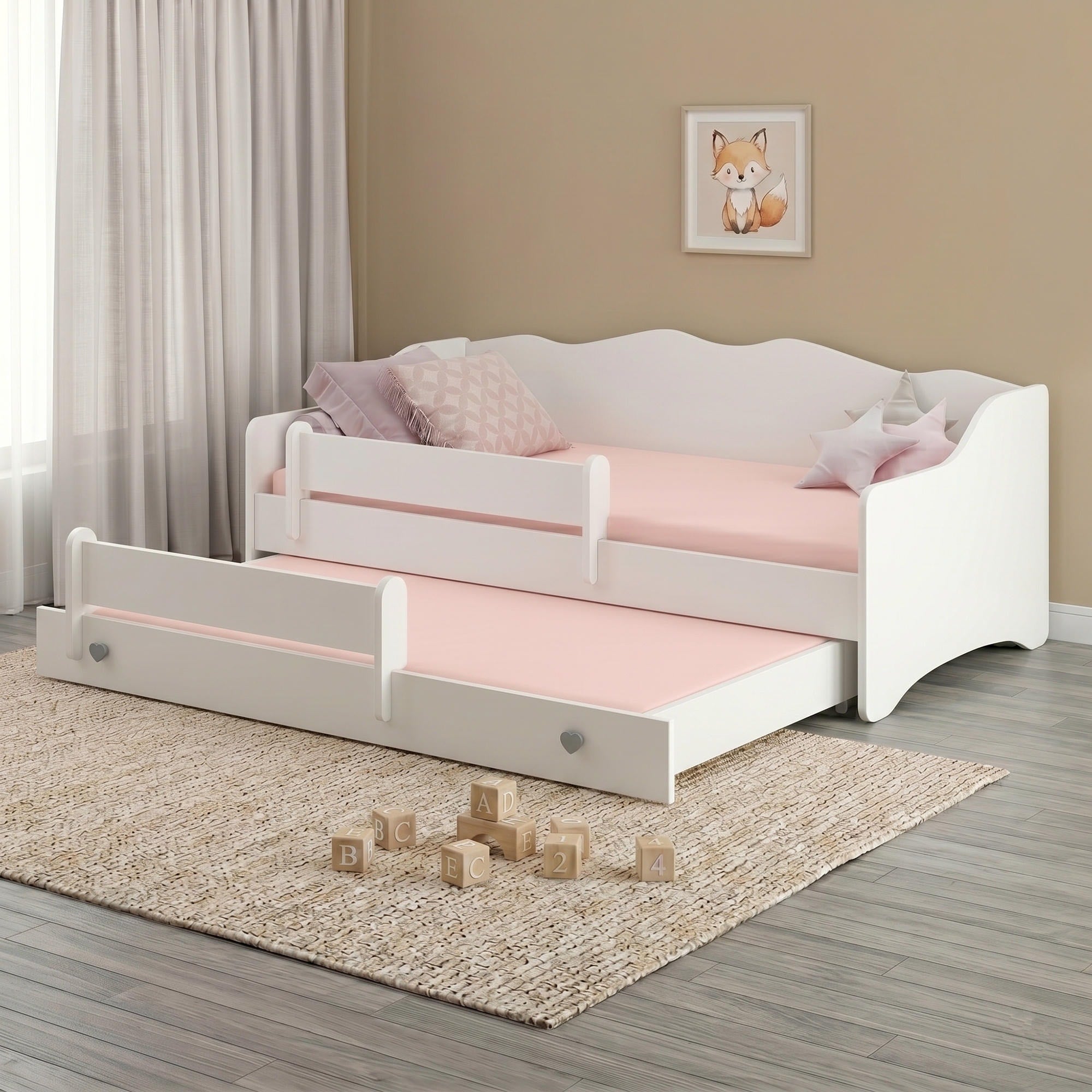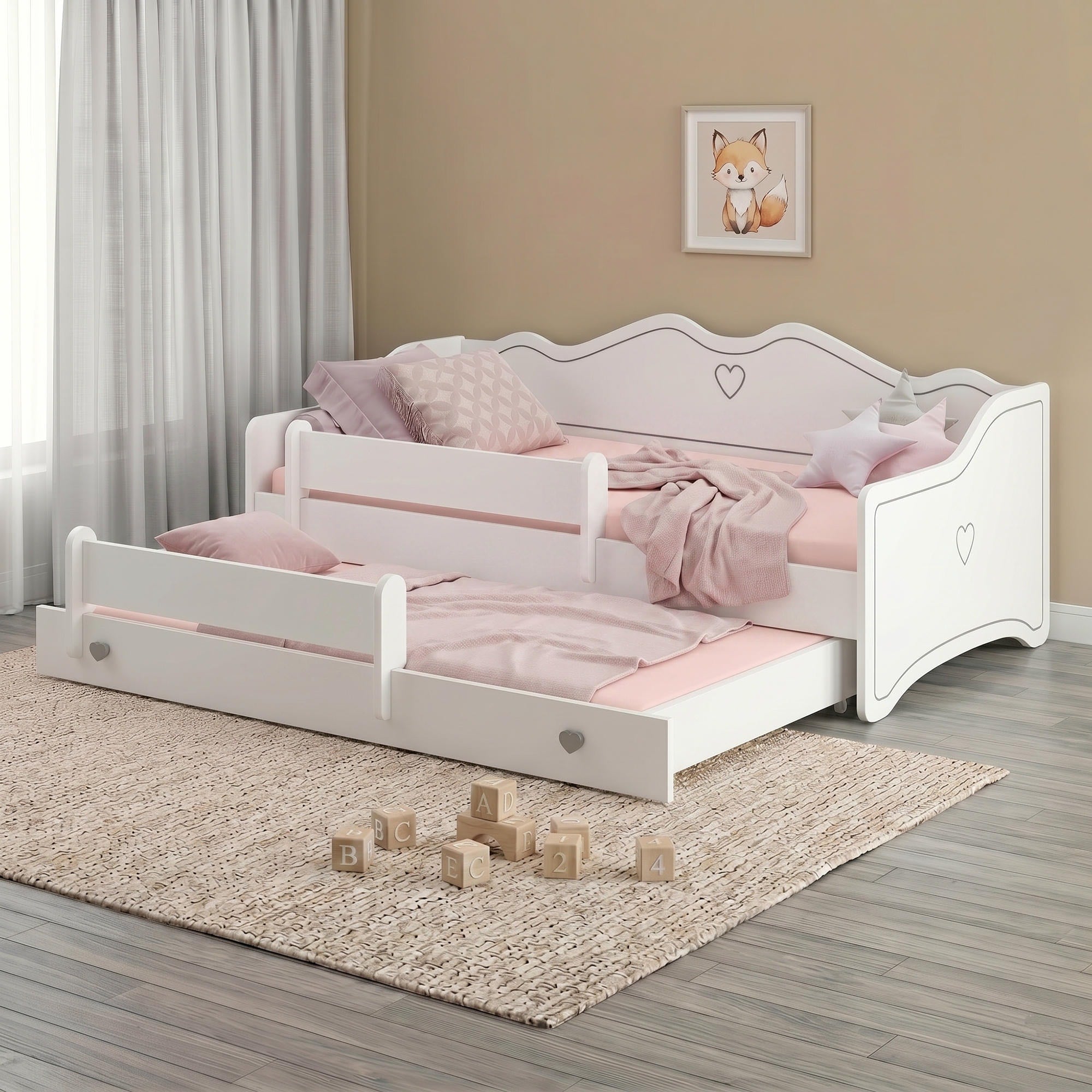 EMMA-MAX est un lit enfant pratique qui réunit confort, sécurité et design délicat. Sa structure blanche, ses éléments décoratifs et ses poignées en forme de cœur en font un beau choix pour une chambre de fille.