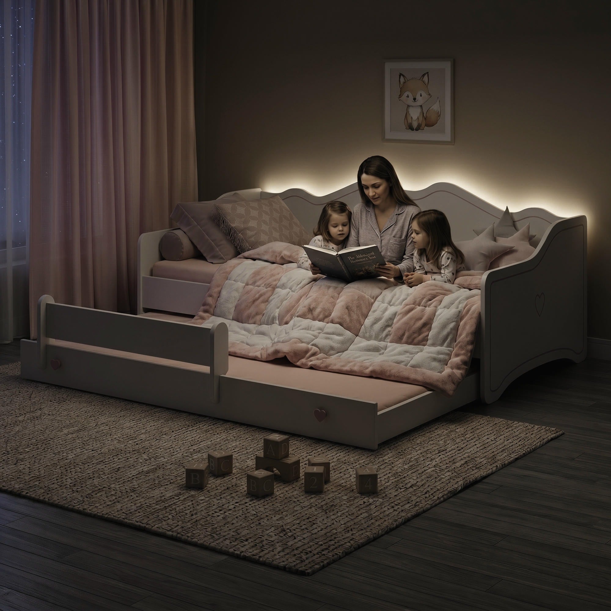 Le dossier haut et les panneaux latéraux permettent d’utiliser le lit comme canapé confortable pendant la journée. La partie inférieure coulissante se transforme rapidement en second couchage complet, idéal pour les frères et sœurs ou les invités.