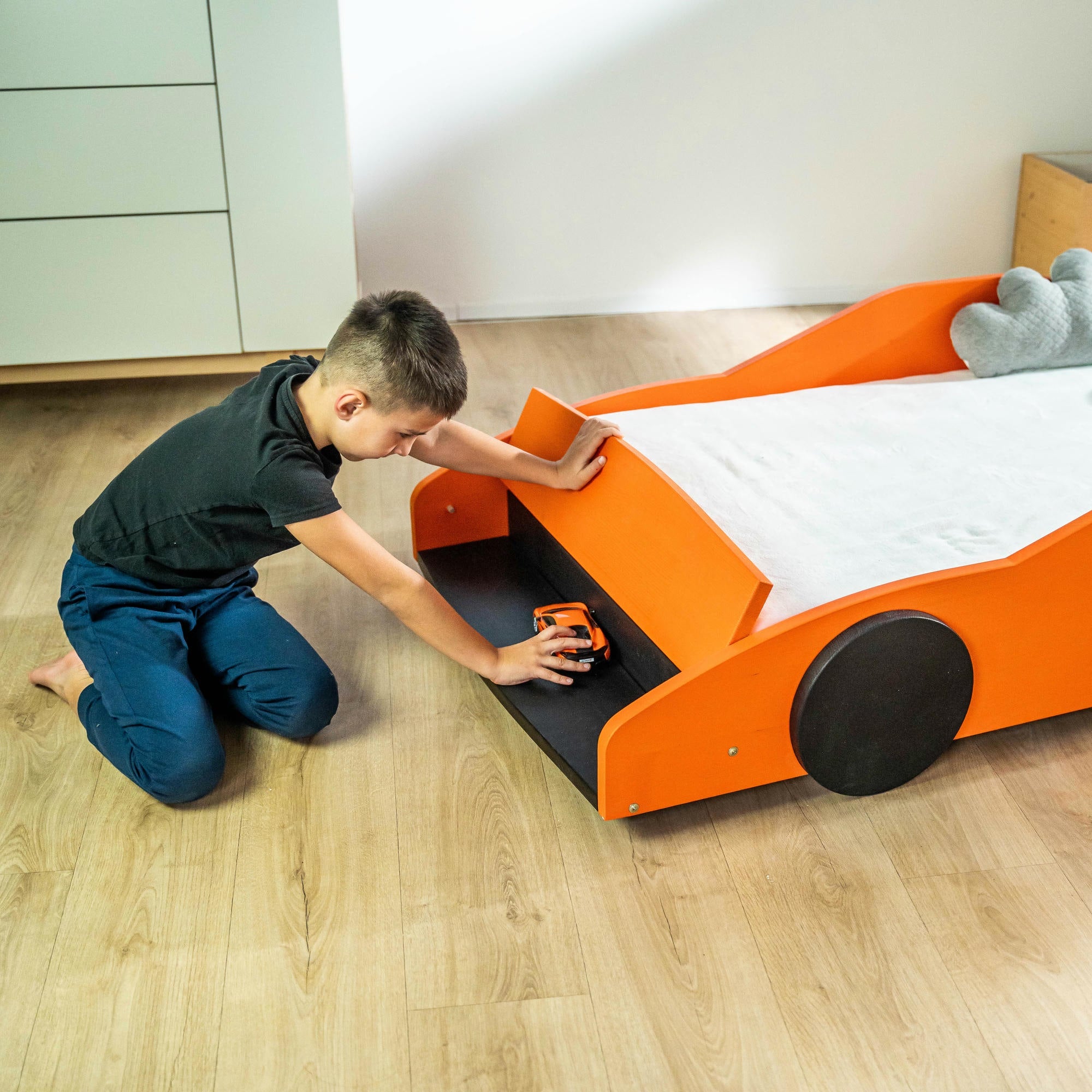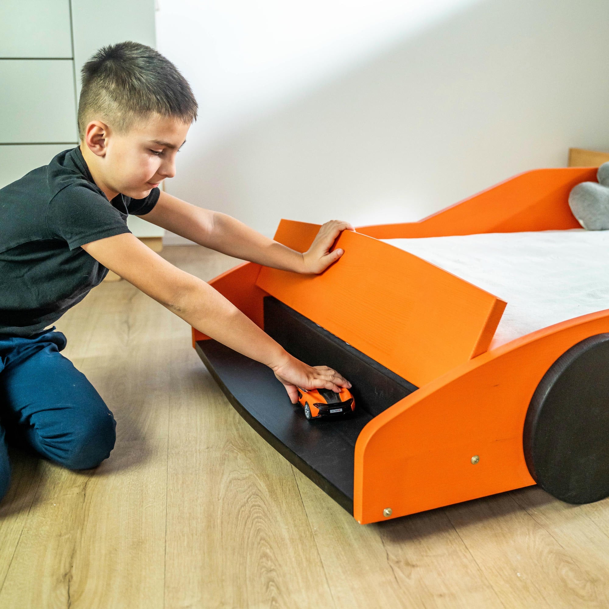 Le lit pour enfants BusyKids BLAZE est un modèle lumineux et élégant en forme de voiture de course, qui transforme la chambre en une véritable piste pour les jeunes pilotes. Son design énergique et moderne stimule l’imagination de l’enfant, rendant chaque soir avant le coucher captivant et plein d’aventure.