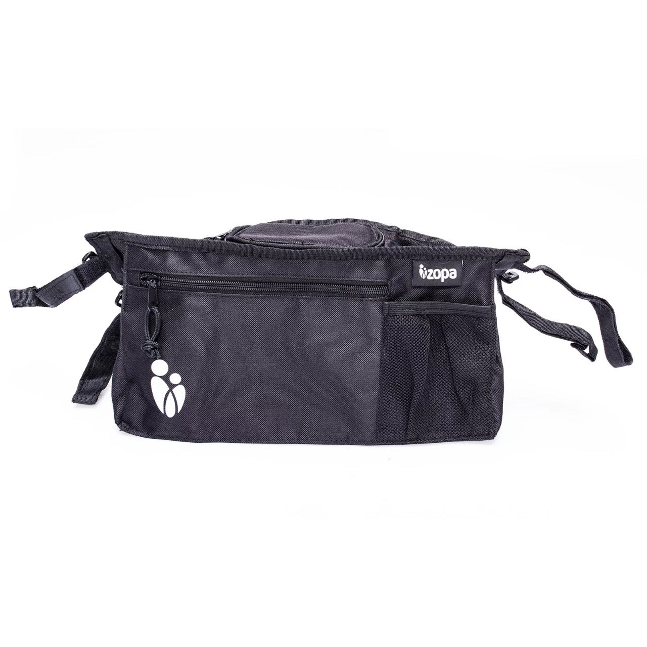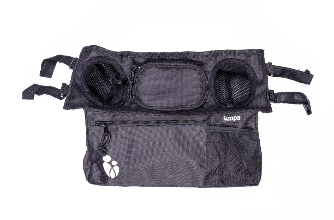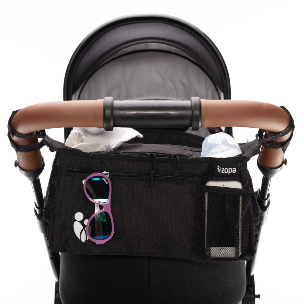 Grande poche zippée, poche pour téléphone, deux supports pour boissons, fixation facile – voici l’organiseur pour poussette ZOPA.