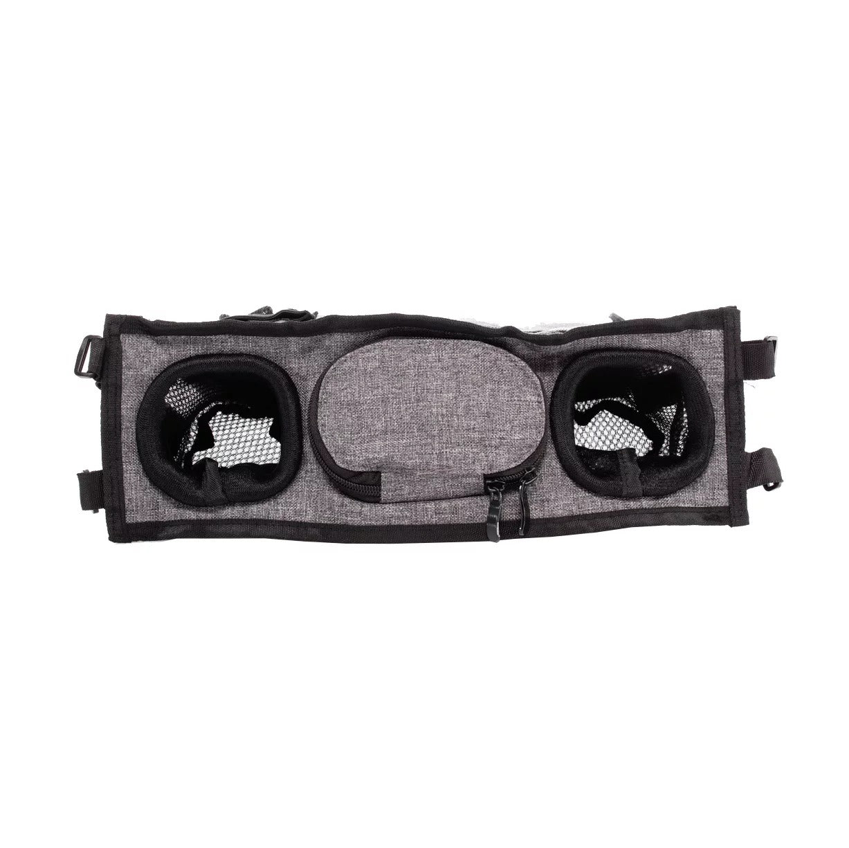 La partie avant de l’organiseur comprend une grande poche zippée pour les petits objets et une poche en filet pour le téléphone portable. Au centre, une grande poche permet de ranger les objets essentiels. Sur le côté, deux supports sont prévus pour les boissons. L’organiseur se fixe facilement sur la poussette grâce à quatre crochets à velcro.