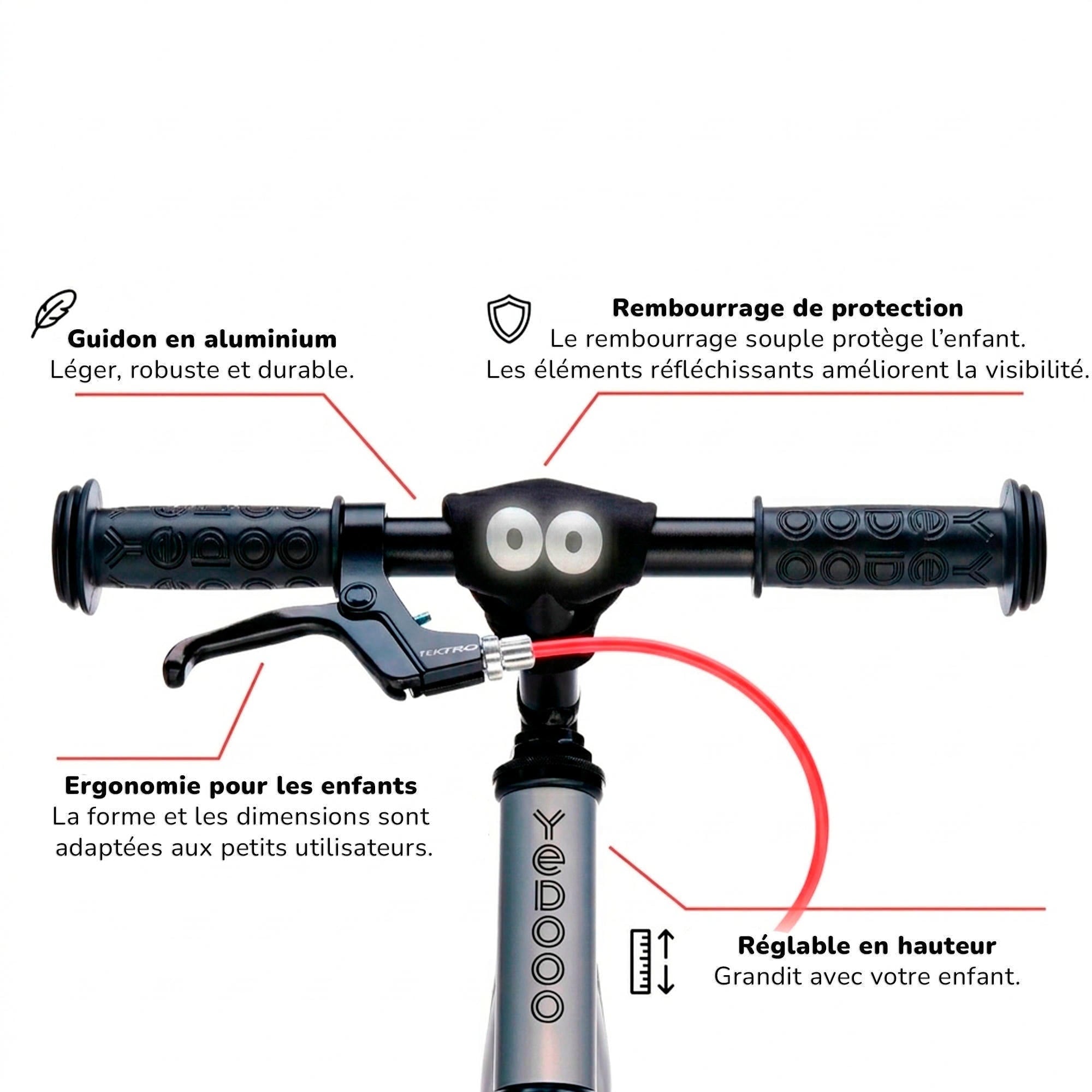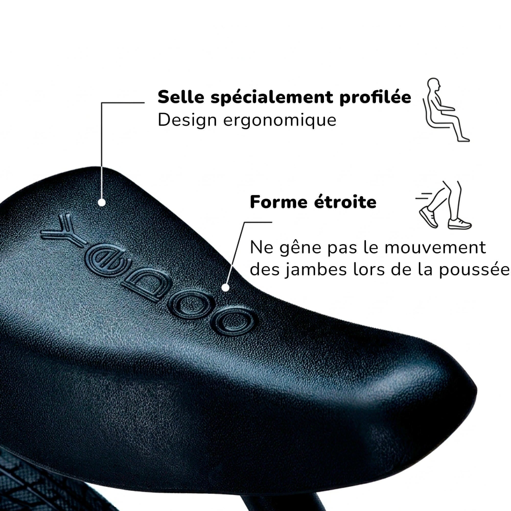 Un cadre léger, un limiteur de braquage, une selle ergonomique et des poignées aux extrémités élargies assurent davantage de sécurité et encore plus de plaisir de conduite.